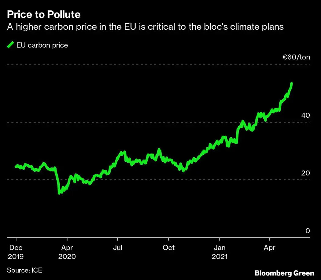 In the European Union, industrial companies are already paying more to release carbon into the atmosphere under the bloc’s emissions trading system. This year alone, the price to emit a ton of carbon has risen about 70% to nearly 55 euros per metric ton.