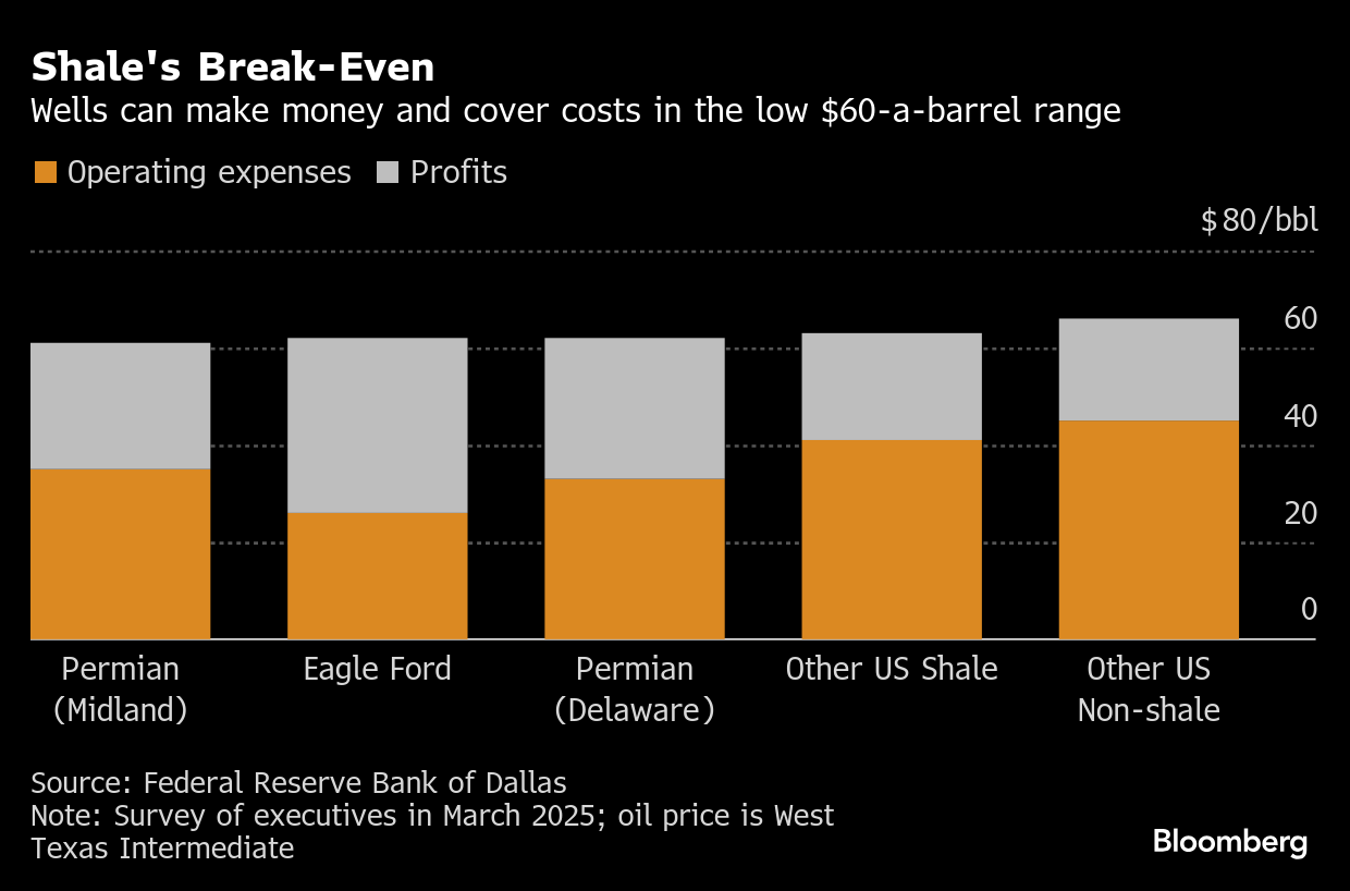 Diamondback Energy Inc., Coterra Energy Inc. and Ovintiv Inc. this week announced plans to raise output slightly for this year or 2026 despite oil prices falling close to the threshold needed for many US shale wells to break even. Last week, Exxon Mobil Corp. cemented its position as the biggest Permian Basin operator by lifting its 2025 production guidance by 100,000 barrels of oil equivalent per day, more than some small companies’ total output.