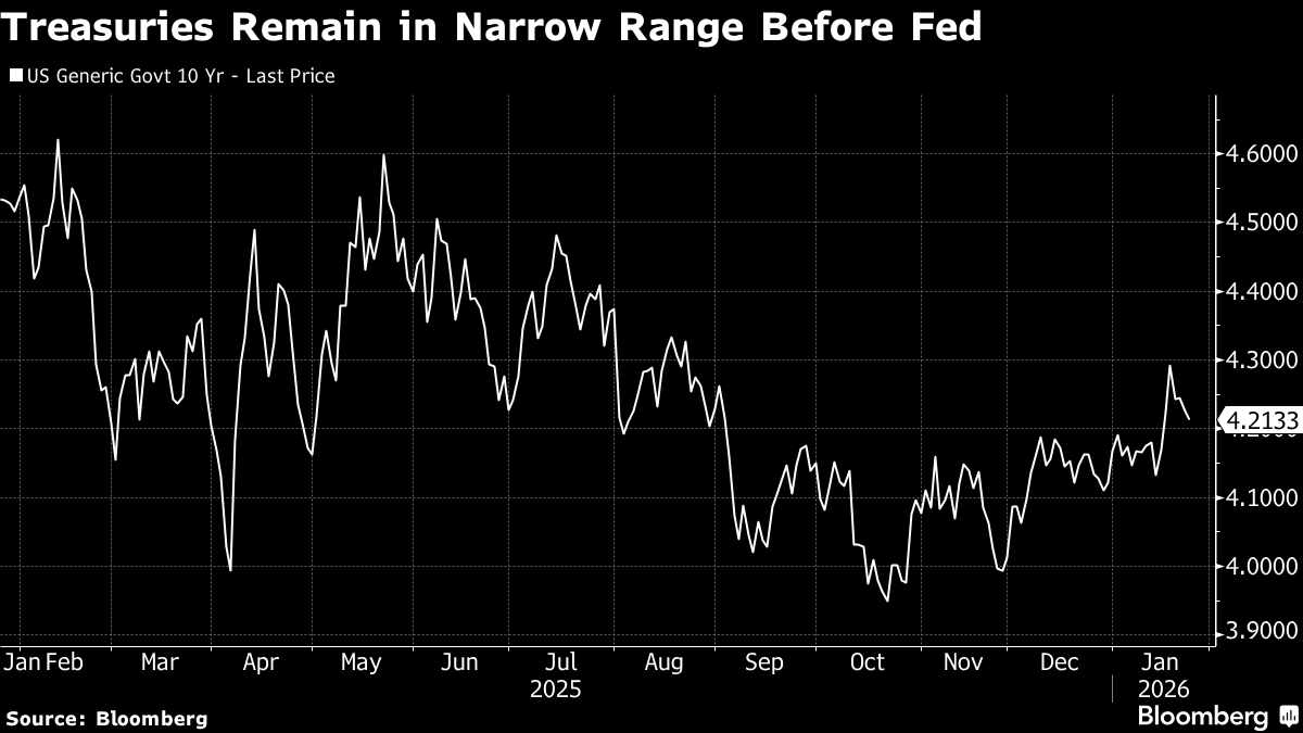 Meantime, Fed officials are expected to hold rates steady after three straight cuts at the end of 2025 as a steadier jobs market restores a degree of consensus at the central bank after months of growing division. Chair Jerome Powell is likely to telegraph his view that policy is well-positioned for now, but refrain from signaling much about where rates are headed.