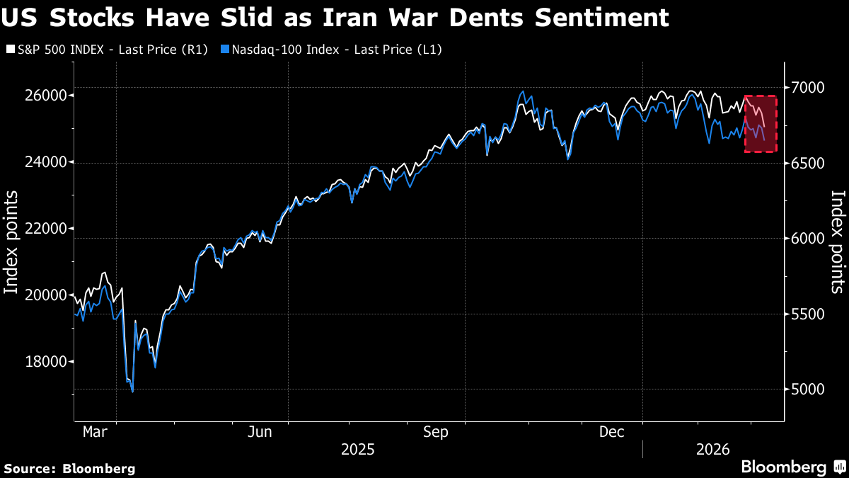 (Bloomberg) -- US stocks are facing a growing risk of a sharp selloff this year as the escalating war in Iran hurts global markets, according to veteran strategist Ed Yardeni, updating his outlook for what he describes as “fast-moving times.”