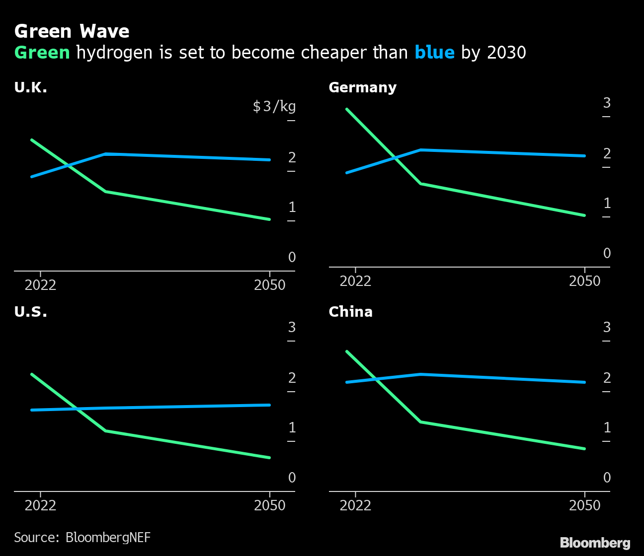 The urgency for gas companies stems from the near-universal backing for green hydrogen, made from water and renewable electricity. The cost of green hydrogen is expected to fall 80% by 2030 and be cheaper than blue in all 28 markets analyzed by BNEF as renewable energy and the electrolyzers using it to make hydrogen both come down in price.