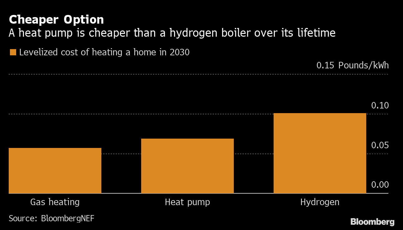 Energy analysts expect prices for hydrogen technology to plunge, but more testing is needed to ensure hydrogen is viable on a commercial scale. Hydrogen boilers will cost households more over their lifetime than either heat pumps, which use electricity to absorb heat from the air, or the natural gas boilers that heat most U.K. homes, according to BloombergNEF.