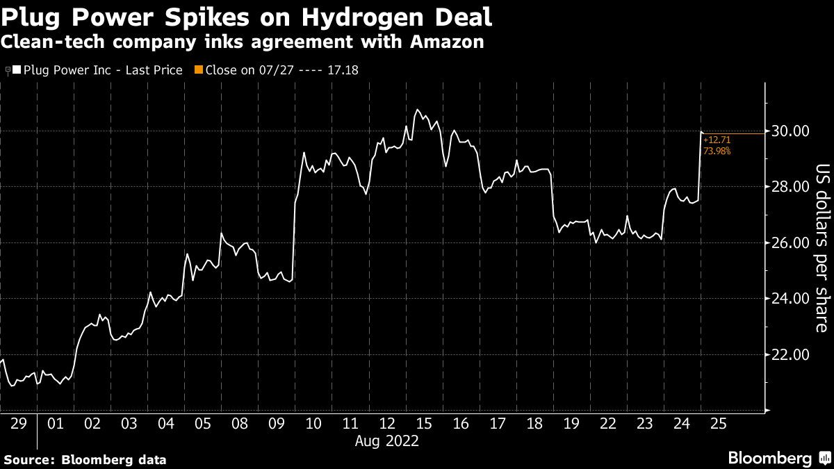 Plug will supply the retail giant with almost 11,000 tons of green hydrogen, which is produced with renewable energy, annually starting in 2025, according to a statement Thursday. The company’s shares rose as much as 14.7%. They were up 7.8% at 10:39 a.m. in New York.
