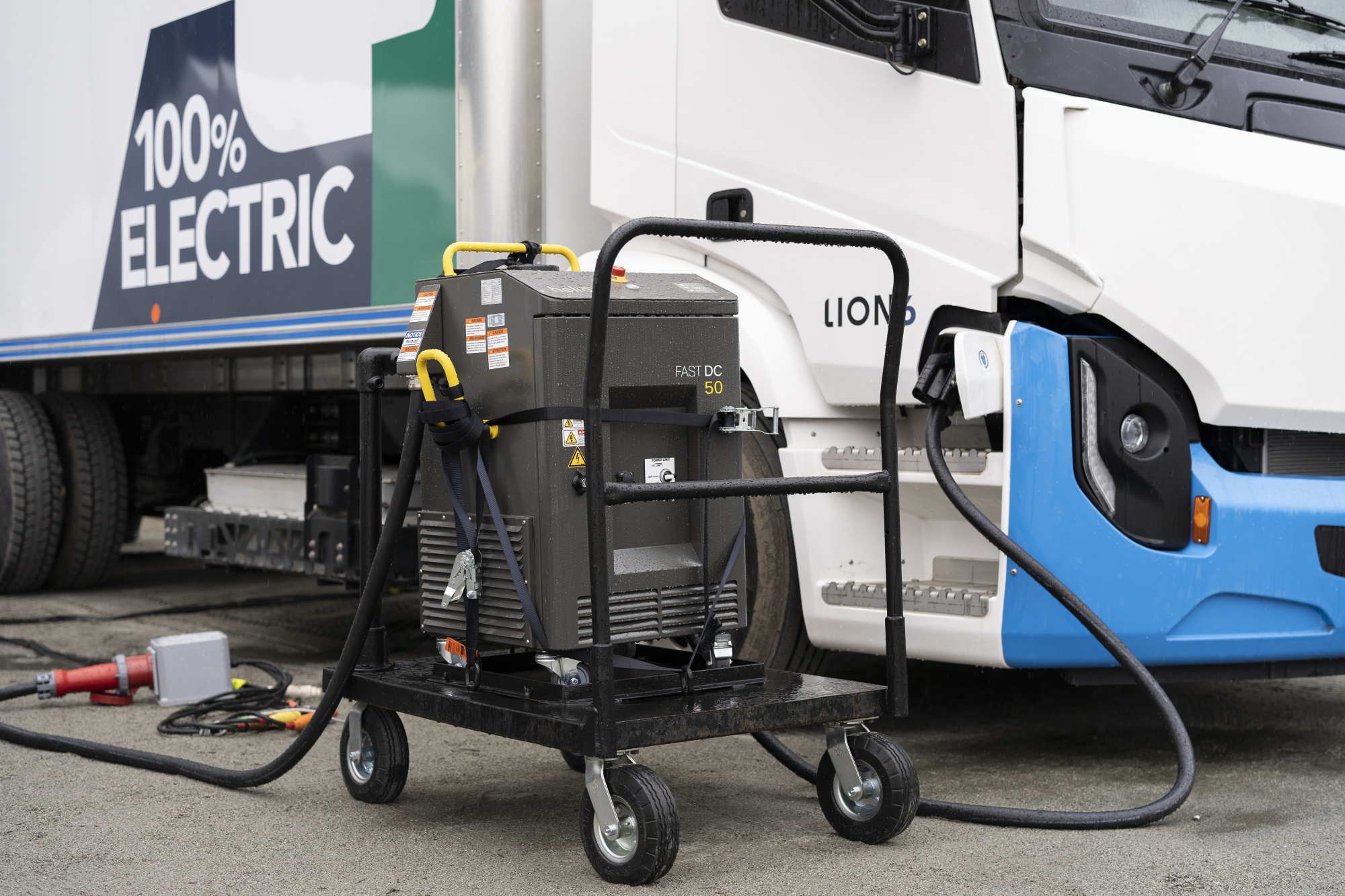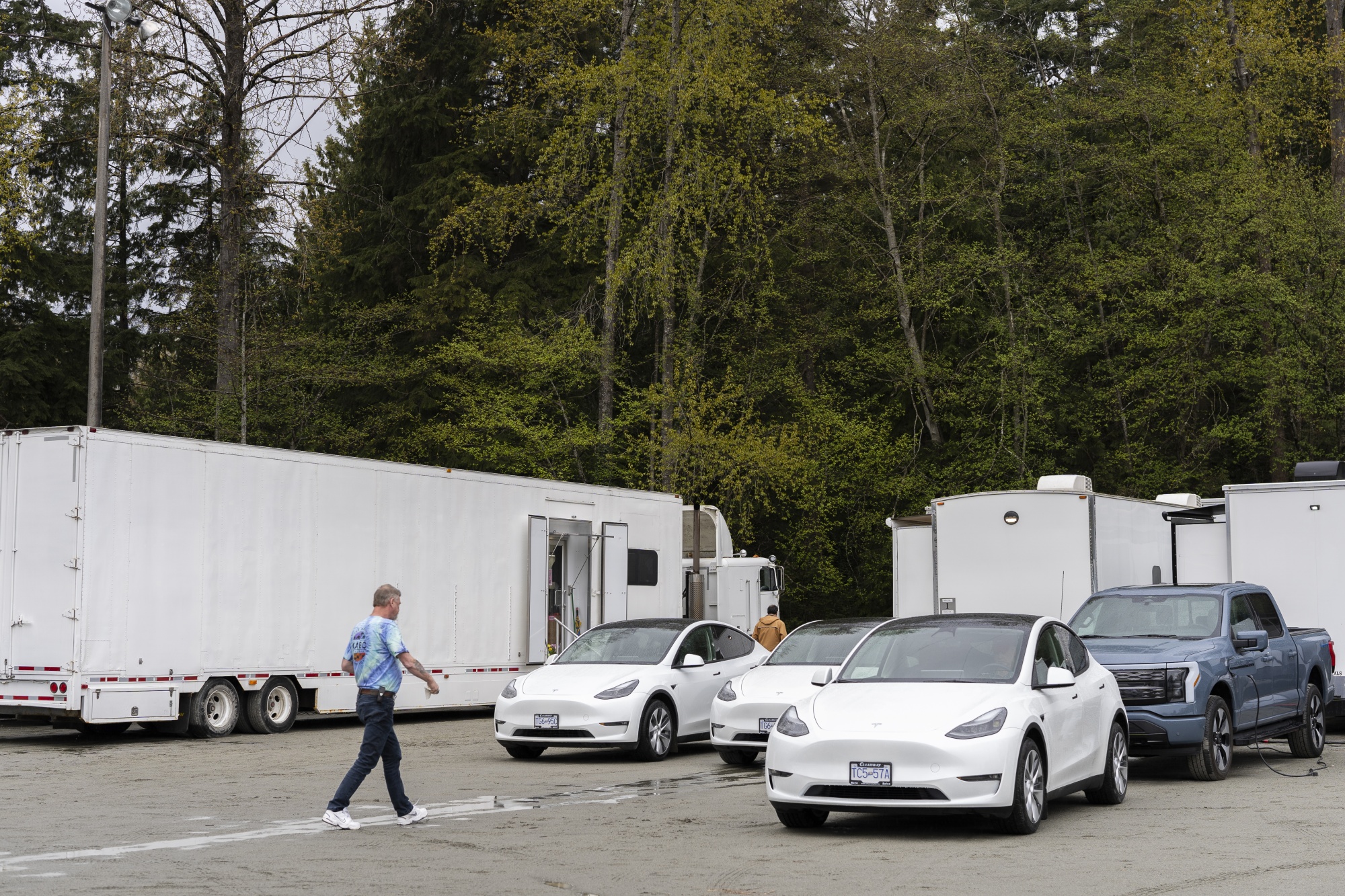 Back at the production’s basecamp, or where trucks and trailers are parked in between sets, Fairbridge’s drivers are eating lunch. It’s a quiet break before they have to drive all the equipment to another location in Burnaby, a neighboring Vancouver suburb, where they’ll be filming that afternoon. These are mostly union crews more used to diesel trucks and gas stations than chargers and Teslas, Fairbridge says. That means he’s added another role to his list of responsibilities: driver therapist. He spends a lot of one-on-one time now coaching them through broken chargers and range anxiety.