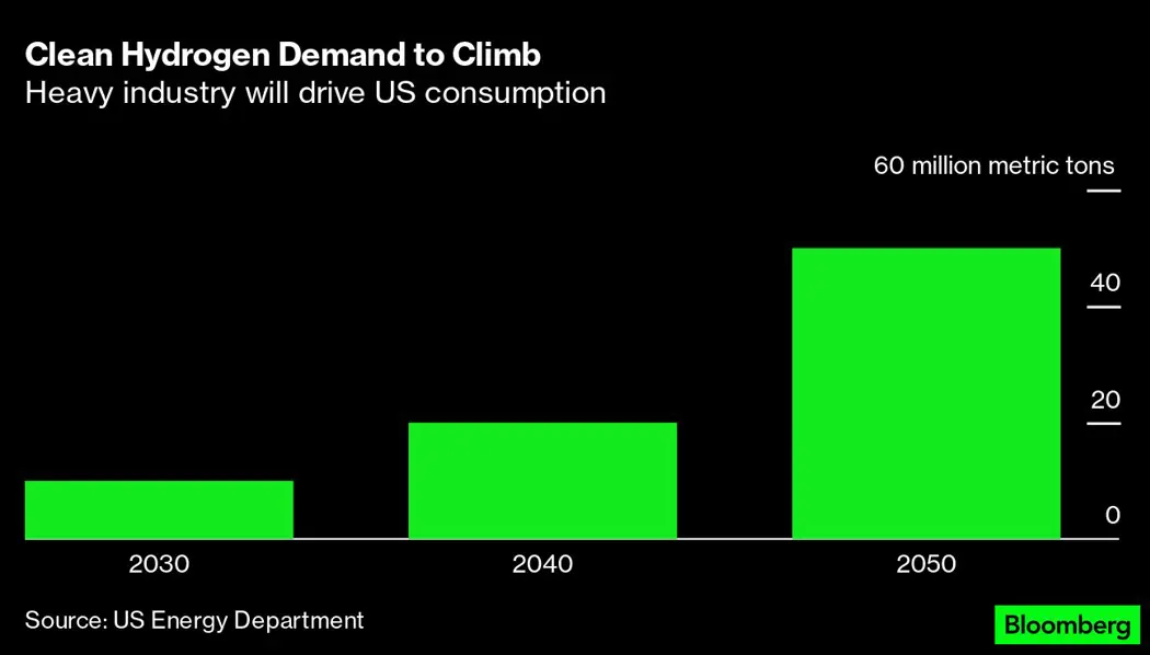 And the US may need a lot of it. Annual demand for clean hydrogen may reach 10 million metric tons by 2030, driven largely by industrial consumption, according to a March Energy Department report. That amount could quadruple by 2050.