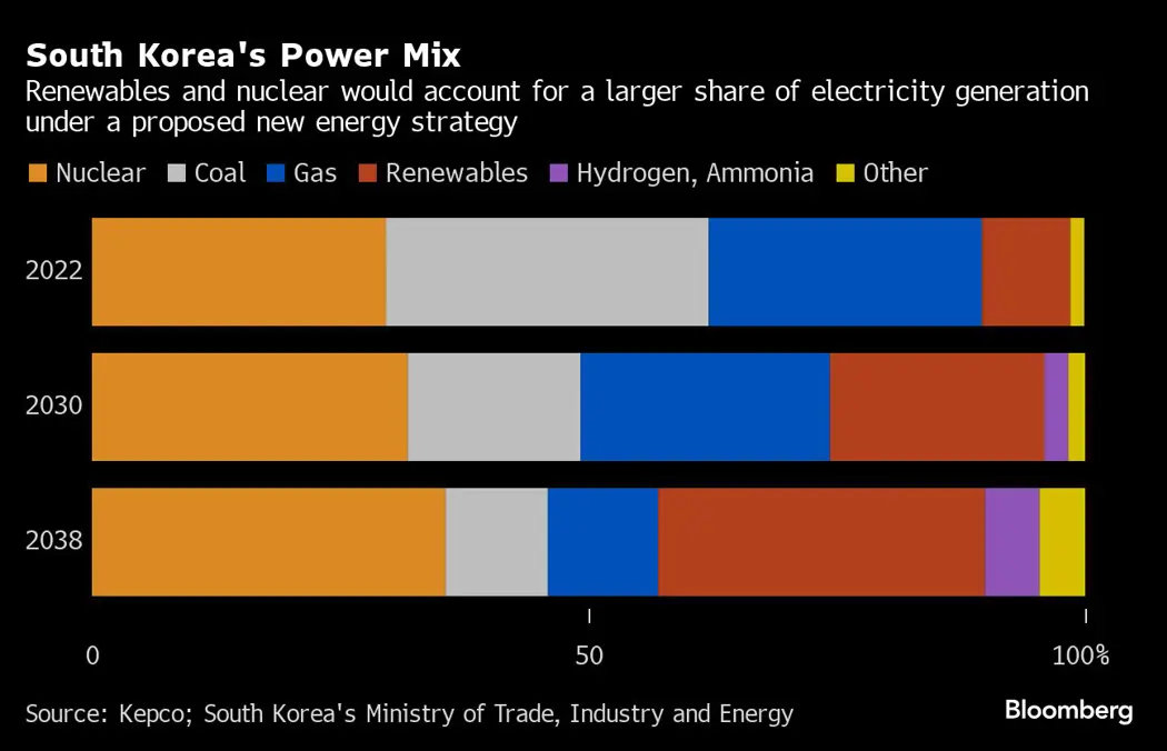 Renewables make up less than 10% of the nation’s power mix. The aim is to double this by the end of the decade and triple it by 2038, but that will still be less than a third of total generation. To meet the gap, President Yoon Suk Yeol’s administration is targeting more nuclear reactors — currently supplying about 30% of the country’s electricity — and wants to retrofit power plants to blend, or co-fire, hydrogen with coal and gas.